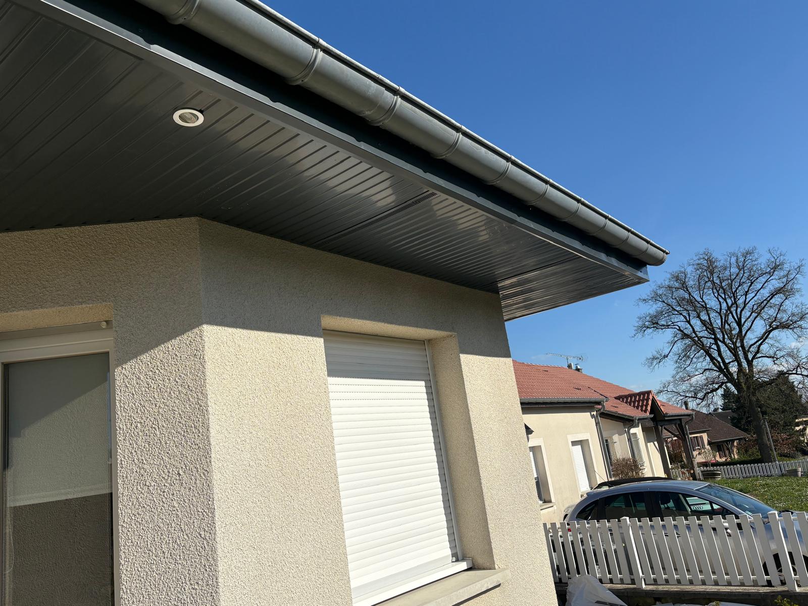 AJS Toiture père et fils a réalisé la pose complète de dessous de toit en PVC gris ardoise sur cette maison individuelle située à Bozoncourt. Ce chantier illustre parfaitement l'importance d'une finition soignée pour protéger la charpente et valoriser l'esthétique de la toiture.